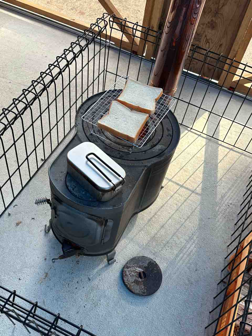 肉が焼ける前に、薪ストーブの上で、