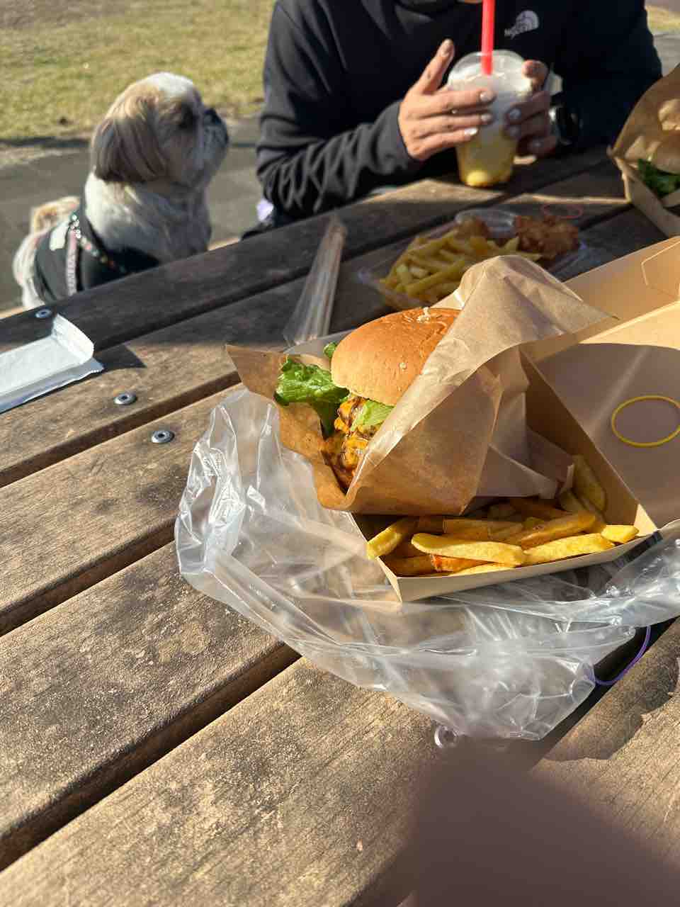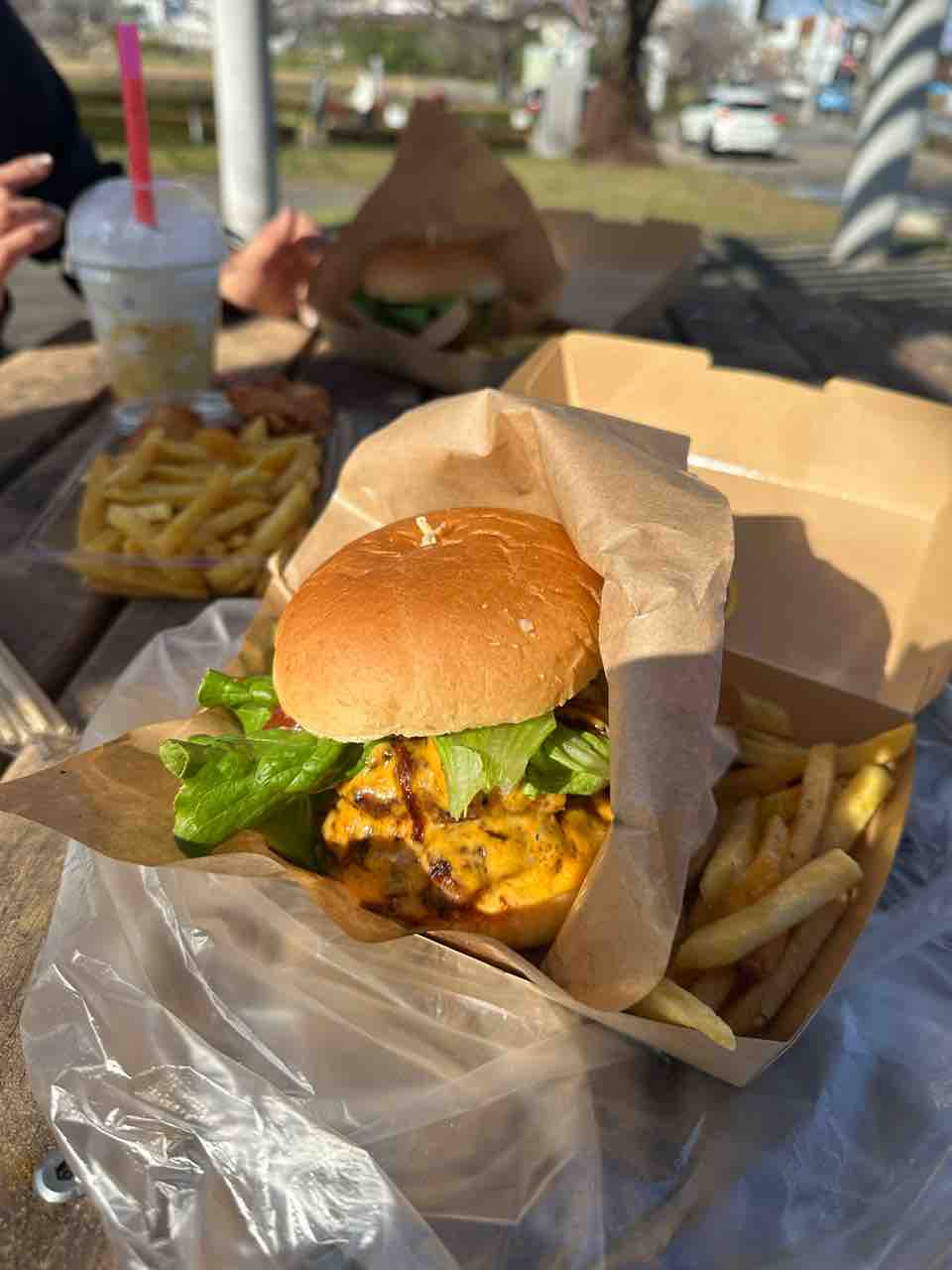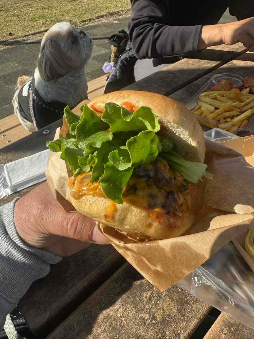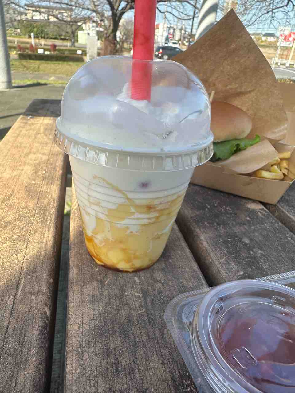 妻は、チーズバーガーと、飲むプリン。^ ^