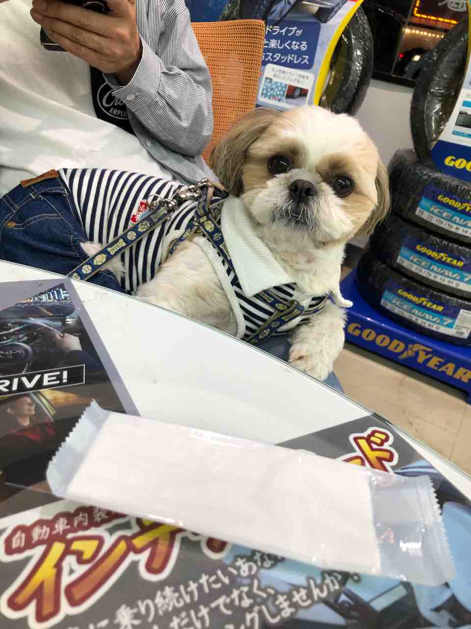 妻のひざの上でおとなしくしてます。