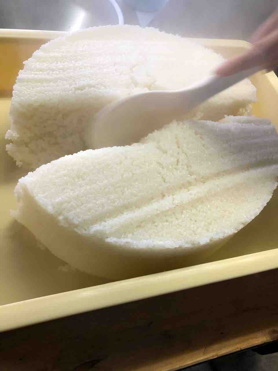 炊けたもち米を箱の中にあけます。