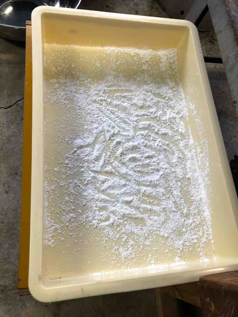 餅が、落ちてくる箱に餅とり粉をひきます。