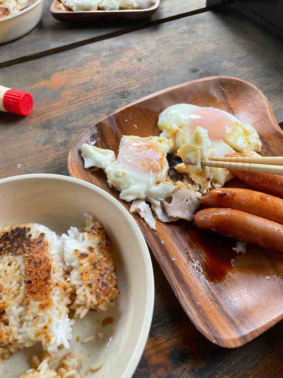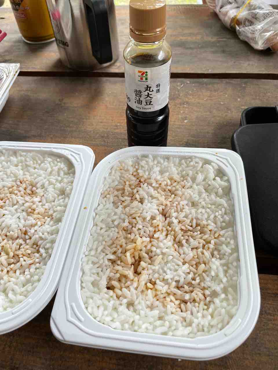 ハムエッグ待つ間に、ご飯に醤油まぶしときます。(^∇^)